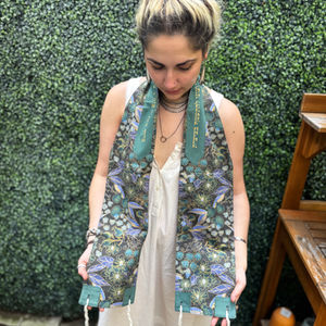 Each tallit is a one-of-a-kind work of art. I start by hand illustrating the design, which I then turn in to a pattern repeat. The designs are custom printed on either cotton or silk. Both fabrics are soft to the touch and wear beautifully. I tie the tzitzit myself, often tying in the traditional Chabad style. It has extra loops on the side to resemble a friendship bracelet to represent how both we and the Divine wear tzitzit. Wearing the tallit is like sharing this friendship bracelet with the Divine.